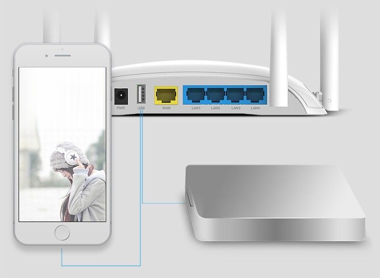 路由器上的USB接口带有扩展作用,可以连接移动硬盘或是U盘。该功能的好处在于,可以通过手机上安装的路由器APP,对其进行随时随地的文件下载。
