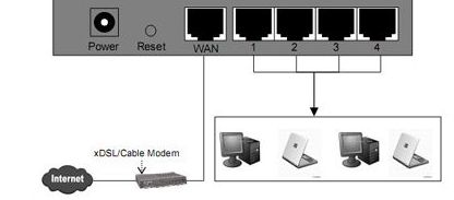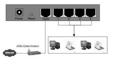 第一步: 将家里的internet网入口网线与路由器的WAN口连接,再用事先准备好的网线将电脑与路由器的LAN口连接。