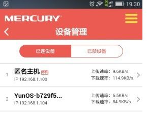 6.接着返回到首页,点击设备管理,可以看到当前已经连接wifi的设备,如果我们需要对某个设备限速的话, 找到对应的设备,点击它