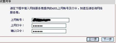 4.接着出现的画面是输入你的上网账号和上网口令,再点击下一步,以便于你的无线路由器在收到上网指令时能够自动拨号上网。