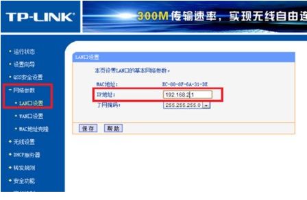 B、老版路由器:方法点击左侧网络参数——LAN口设置——将路由器LAN口地址设置成192.168.2.1——保存设置,见下图;