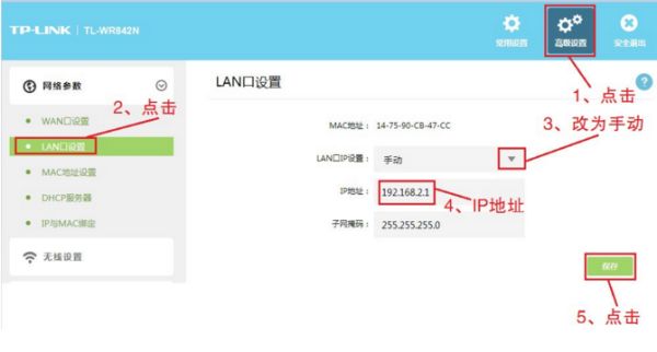 A、新版路由器: 方法点击右上方高级设置——LAN口设置——将路由器LAN口IP设置修改为手动,地址设置成192.168.2.1——保存设置,见下图;