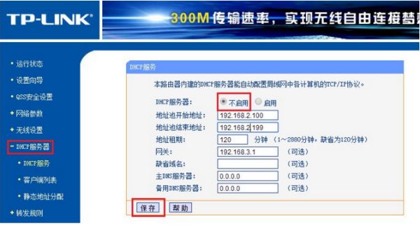 B、老版路由器:方法左侧DHCP服务器,把DHCP服务器设置为不启用——保存设置,见下图;
