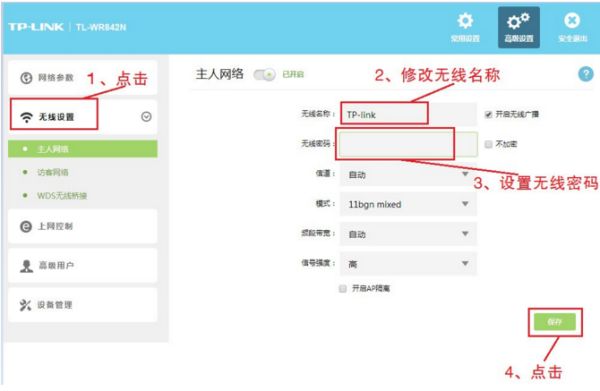 A、新版路由器:点击无线设置,无线名称,可以自行设定,建议使用字母和数字组合,最好修改一下无线名称,使两台路由器无线名称不相同以方便选择,无线密码,密码用于连接无线网络时输入验证,能保护您路由器的无线安全,设置无线登陆密码,防止别人蹭网,见下图;