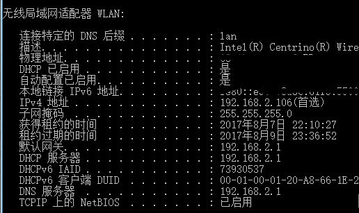 用电脑连接主路由器,在CMD下输入ipconfig /all来查看当前主路由器分配的地址。