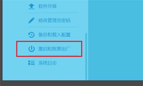 2、点击路由设置之后,进去路由设置界面,有软件升级,修改管理员密码,系统日志等选项设置,点击“重启和恢复出厂设置”。