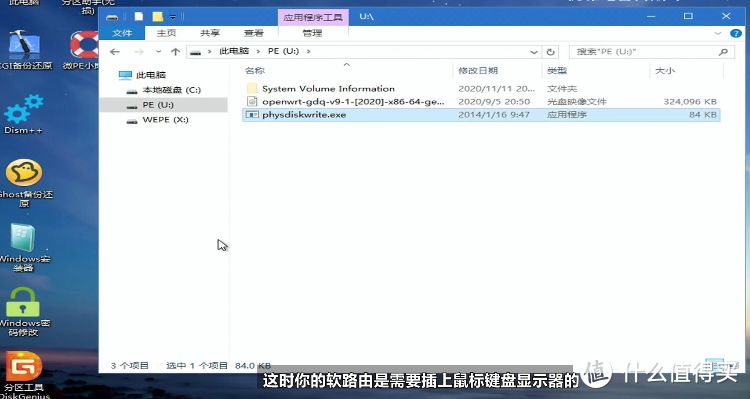 制作一个系统启动U盘(这里我用的微PE),一台当作软路由的mini小主机(插上鼠标键盘和显示器)、OpenWRT的img映像文件(这个版本比较多,我选的是eSir大神的高大全固件)、physdiskwrite写映像文件的工具。