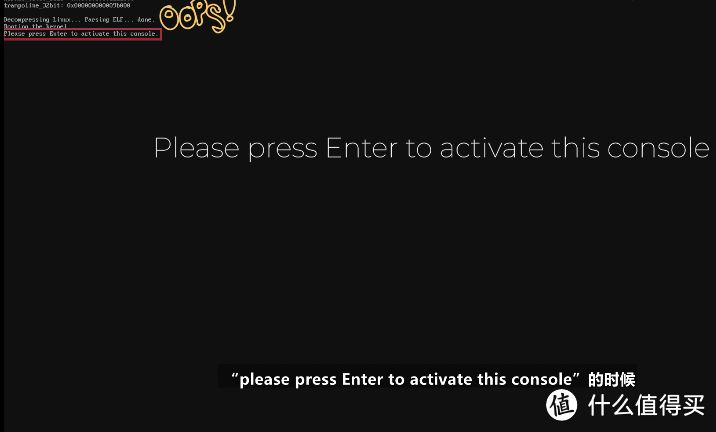 2.1、当看到please press Enter to activate this console这个提示的时候软路由就启动好了(Esir的固件是不跑码的,没看到满屏的代码不用慌。),系统就安装完成了,直接按回车即可。