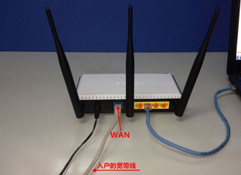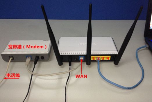 1、首先将modem(调制解调器)端的网线与路由器上wan接口(此接口通常颜色或位置区别其他几个相同外观的接口)如图: