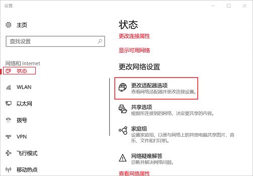 2、在设置界面,打开“状态”,点击“更改适配器选项”。