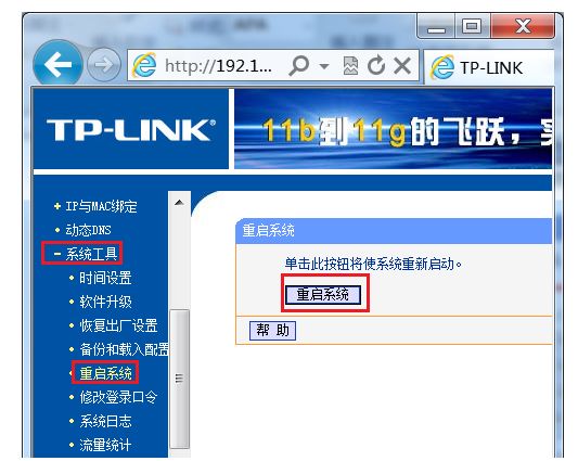 (4)重启路由器:设置完成后,要重启路由器才能生效,重启方法,在系统工具下面,选择“重启路由器”这一项即可。