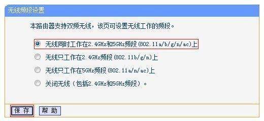 登录路由器的管理界面后,进入 无线频段设置,选择“无线同时工作在2.4GHz和5GHz频段(802.11a/b/g/n/ac)上”,再点击“保存”。