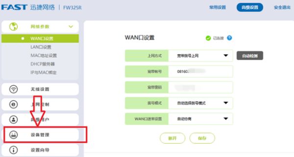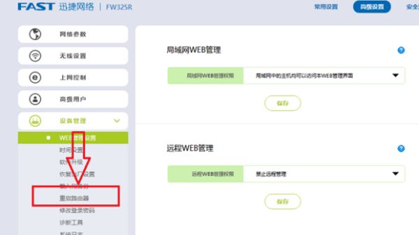 11.“设备管理”选项具有下拉列表,选择列表中的“重启路由器”按钮可进行不断电重启。