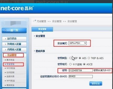 2、展开无线管理——安全管理,选择一种密码类型,输入WIFI密码,点保存生效;