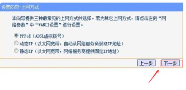 5.然后在提供的3中上网方式中据个人情况选择(一般情况下,如果你是自家拨号的话选“PPPoE”,动态IP的话电脑直接插上就能上网,静态IP一般是专线,像小区啊,宿舍什么的),单击“下一步”