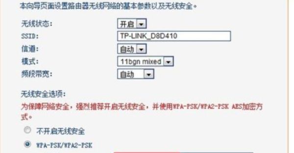 8.然后下一步后进入到的是无线设置,可以看到无线状态(调为开启)信道(设为自动)、模式(通常选11bgn)、安全选项(选wpa-psk/wpa2-psk,这样安全,免得轻易让他人破解而蹭网)、SSID(就是指WIFI名字,你自己设置就好了)