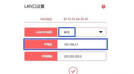 点击“高级设置”——>“网络参数”——>“LAN口设置”——>“LAN口IP设置”选择:手动——>“IP地址”修改为:192.168.2.1——>点击“保存”。