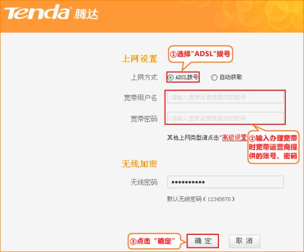 此处我们以“ADSL拔号”为例进行设置,设置页面中选择“ADSL拨号”, 在“宽带用户名”、“宽带密码”中输入宽带运营商(例如:电信、联通等)提供的宽带用户名和密码 ,点击“确定”即可。