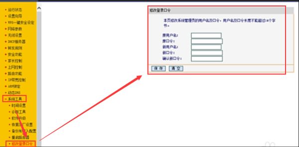 点击左侧的 系统工具 — 修改登陆口令,修改默认登陆密码,新密码建议配合使用大小写字母、数字符号和特殊符号一起使用,不建议使用字母/数字等纯密码。