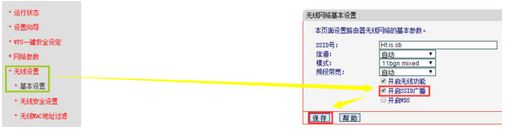 点击左侧的 无线设置 — 基本设置 — 开启 隐藏SSID,然后保存。隐藏无线网账号后,连接需要手动输入无线网络账号,无法通过手机等电子设备的无线功能自动搜索出来。