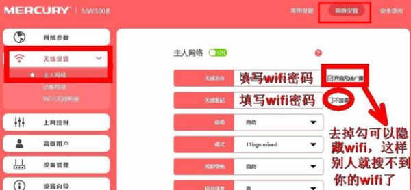 5.设置wifi名称和密码。依次点击【高级设置】—【无线设置】—【主人网络】,填写要设置的wifi名称和密码。设完点击保存按钮,如图所示: