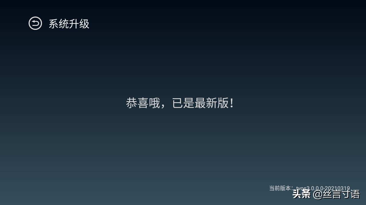 好了,接下来,咱们来看看使用!线材的连接很是简单,插上电源线,再用HDMI线材连接上电视就可以了!就泰捷盒子来说,使用的是基于安卓系统的TVUI,当前版本是TVOS3.0.0.0-20210319,系统版本的更新还是能跟上实时需要的,咱们来看看!