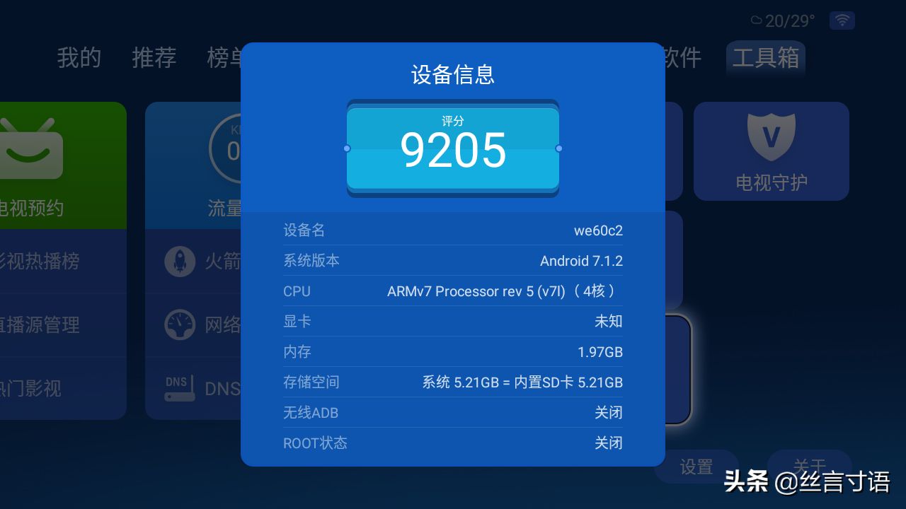 那么,有这么多的内容,肯定需要硬件的支持!这款盒子采用了ARMv7 Processor rev 5(V71)4核处理器,运行内存为2G,存储内存为8G,对于一款电视盒子来说,已经非常不错了!当然,像小丝一样为了导出里面的截图,在上面装了100M+的百度网盘,确实是卡的一批!