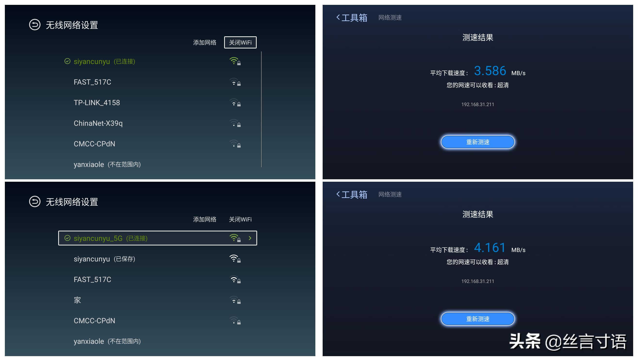 那么5GWIFI频段和2GWIFI频段的速率在盒子上究竟有着怎么样的表现呢?咱们看看测评效果!如下图,2GWIFI频段盒子在接收内容时的下行网络为3.586M,而5GWIFI频段在接收内容时的下行网络为4.161M,虽然都满足了高清电影的要求,但是给人的感觉是不一样的不是吗?目前貌似除了手机、平板,还没有哪款其它设备使用双频WIFI呢!