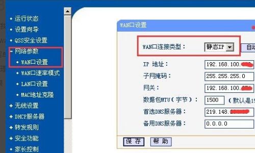 2、接下来我们点击 【网络参数】- 【WAN口设置】 wan口连接类型 改为 静态IP IP地址 填写单位局域网 100段的IP(最好跟单位网络管理员要一个固定IP) 子网掩码 网关 DNS 跟 100段的 一样。 点击保存。