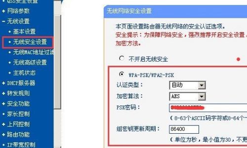 5、点击【无线设置】-【无线安全设置】 来给 我们的wifi设置 访问密码 选择WPS-PSK PSK密码里添 您要设置的wifi密码。周期可以设置为0 不更新改变。