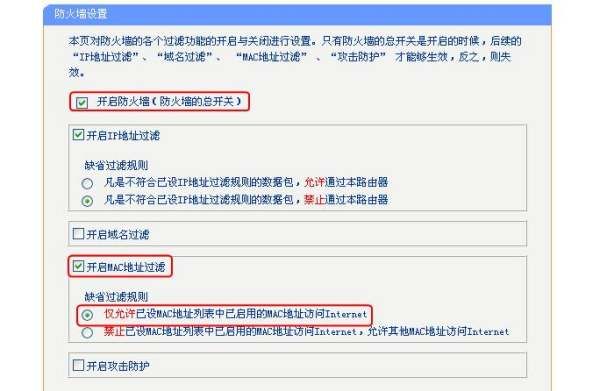 2、点击“安全设置”—>“防火墙设置”—>在右侧弹出的界面中勾选“开启防火墙(防火墙的总开关)”、“开启MAC地址过滤”这两项—>在“缺省过滤规则”中选择“仅允已设MAC地址列表中已启用的MAC地址访问Internet”-->“保存”,这样就可以了。