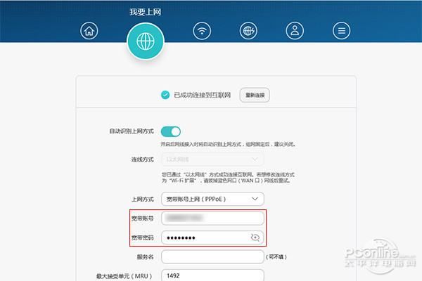 2. 进入路由器设置界面,输入上网账号和上网密码。这里的上网账号和上网密码是电信小哥(或者移动或者联通)上门帮你安装网线时给你的上网凭证,一般会在报装单上注明。不是wifi名和wifi密码!