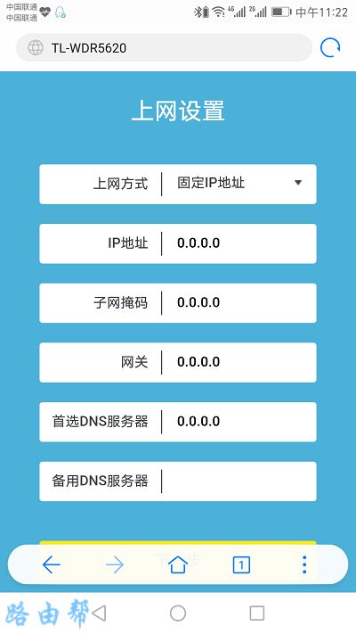 (3)、如果检测到上网方式(连接方式)是:静态IP ——>需要在页面中填写:IP地址、子网掩码、网关、首选DNS服务器、备用DNS服务器,如下图所示。