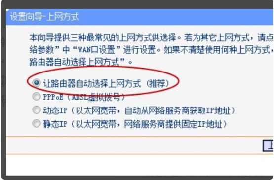 5、随后,完成上述步骤后,点击下一步——选择第一项【让路由器自动选择上网方式】,如下图所示,然后进入下一步。