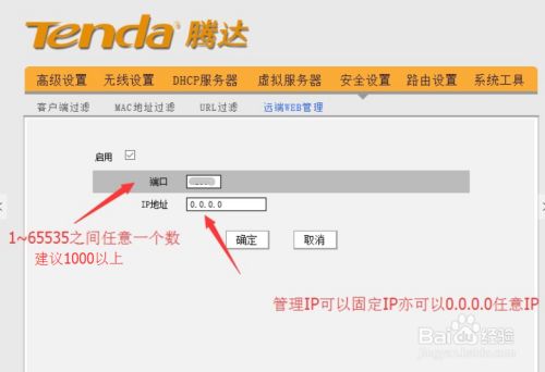 接着输入“端口号”和“IP地址”,并点击“确定”。(注:端口号可以输入1~65535之间的任意一个数。IP地址输入0.0.0.0是方便管理,当然也可以固定IP地址,这样更安全。我这里就用0.0.0.0,这样在外面随便一台电脑都可以进行远程管理了)