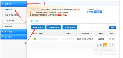 然后点击“动态域名”选项卡,选择“域名列表”选项,点击“创建动态域名”。