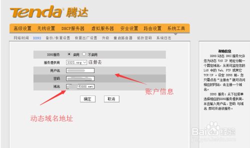 切换到“系统工具”选项卡,选择“DDNS”,并“启用”DDNS服务。这里就需要去注册一个动态域名了,腾达路由器上正好附带注册网址,直接点击“去注册”。