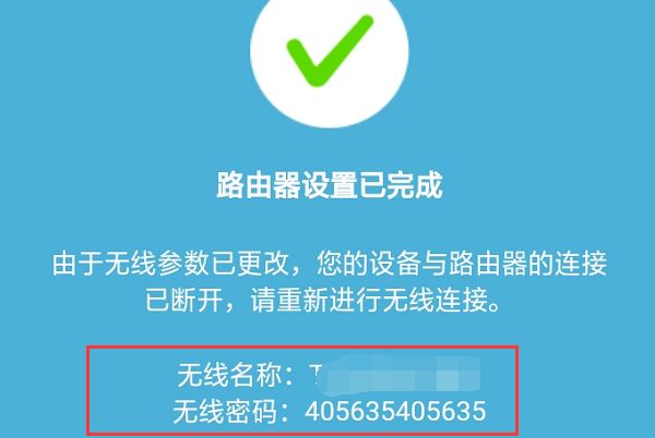 7、此时可以看到页面的提示消息,显示路由器设置已经完成并告知了对应的WIFI名称以及密码。