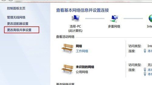 1 在“打开网络和共享中心”界面中单击左侧的“更改高级共享设置”。