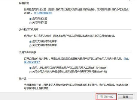 2、对您的网络工作环境进行选择,需要一些简单的设置:在“启用网络发现”、“启用文件和打印机共享”前选为实心,如果启用密码保护共享,访问共享文件则需要密码。如果关闭密码保护共享,访问就不需要咯。其他选项全部是设置默认,在最下面保存退出。
