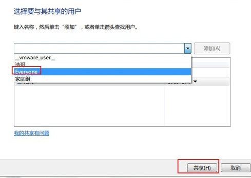 3、选中你要共享的文件夹,用右键点击,在快捷菜单中点击“共享”,然后再“特定用户”下拉列表中选择“Everyone",权限的设置就要根据自己的需要。最后,点击“共享”就可以退出了。