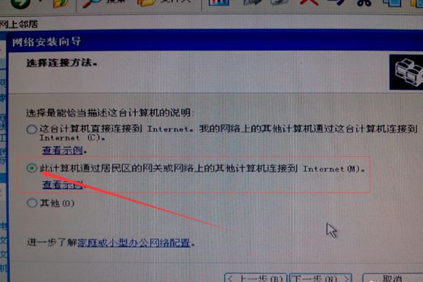 3、然后在新的对话框中将“此计算机通过居民区的网关或网络上的其他计算机连接到Internet(M)”前面点中,然后按下一步。