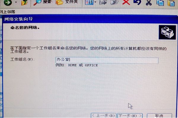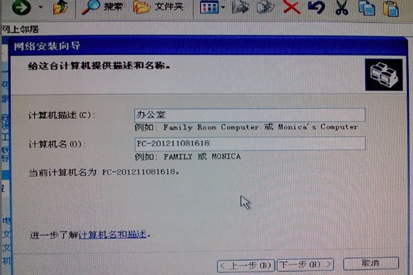 4、要新的对话框中,计算机描述:办公室;计算机名:可以不用改变,然后点击下一步。在新的对话框中将工作组名写为:办公室,然后点击下一步。