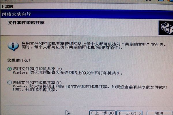 5、在新的对话框中选择“启用文件和打印机共享”,然后点击两次下一步。