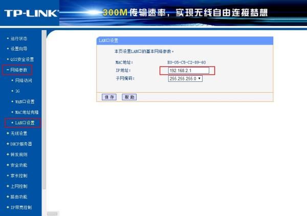 在 网络参数 设置里,将 LAN口设置 里面的 IP 地址 修改为192.168.2.1(以后就登陆这个地址来管理这个路由器B)。