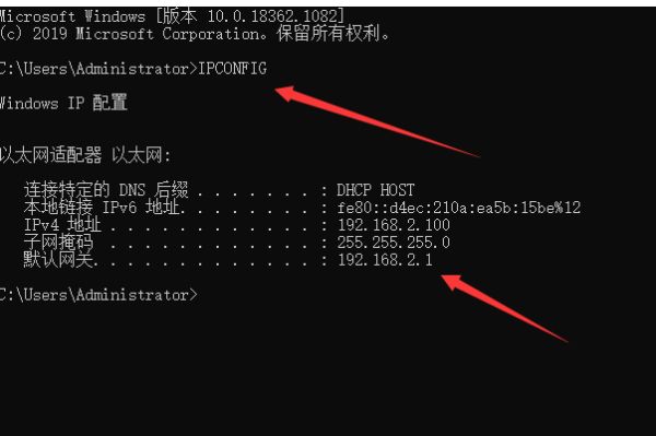 2、在出现的命令对话框中输入IPCONFIG按回车,记下当前的光猫网关。