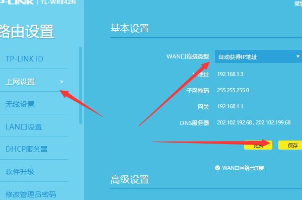 6、在出现的路由设置界面中点击上网设置,选择WAN口连接方式为自动获取IP地址以后点击保存按钮。