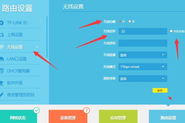 7、再点击无线设置,勾选开启无线功能并输入无线名称和密码点击保存。