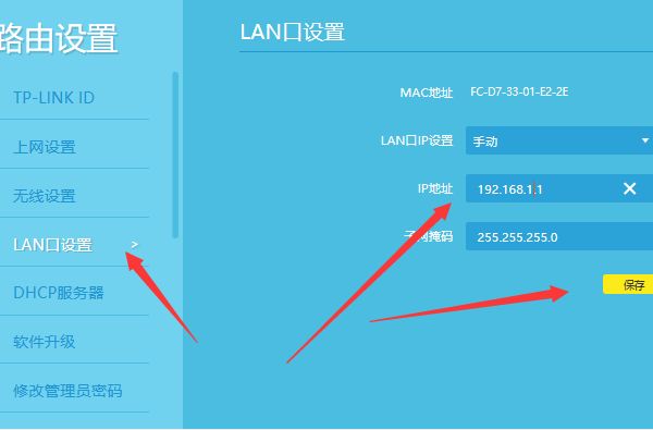 9、此时点击LAN口设置,将该路由器的IP地址设置为不同于之前记下的光猫网关地址点击保存。