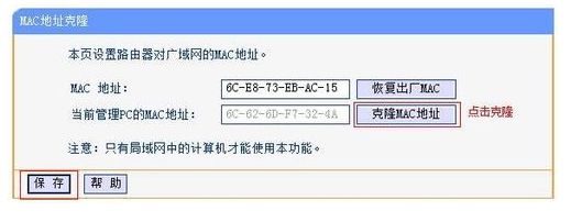 4、如果明确宽带已经绑定电脑的MAC地址与静态IP,则需要将电脑的MAC地址克隆在路由器WAN口,让路由器“伪装”成为电脑顺利上网。克隆MAC地址的方式如下:将之前直接连接宽带上网的电脑用网线连接到路由器LAN口。登录管理界面,在 网络参数 >> MAC地址克隆 中,点击 克隆MAC地址,确保两个MAC地址相同后,保存重启。如图